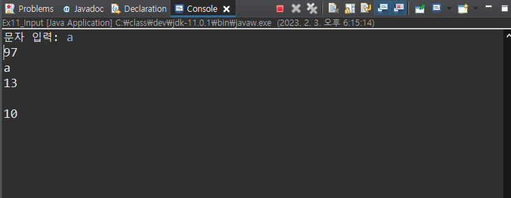 - 그 이유는 : a를 입력하고 enter도 입력이 된 것인데. \r = 13을 의미하고, \n 10을 의미하여 해당 두가지가 출력이 되게 되는 것이다. 또한, 나머지 2개에 대한 입력이 없어 오른쪽 상단에 디버깅이 종료되지않고 실행되고 있는 상태가 지속되는 것을 볼 수 있다.