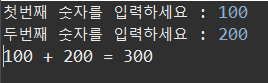 - 요구사항] 사용자로부터 숫자를 2개 입력 > 두 수의 합을 구하시오. (연산과정도 같이 출력)