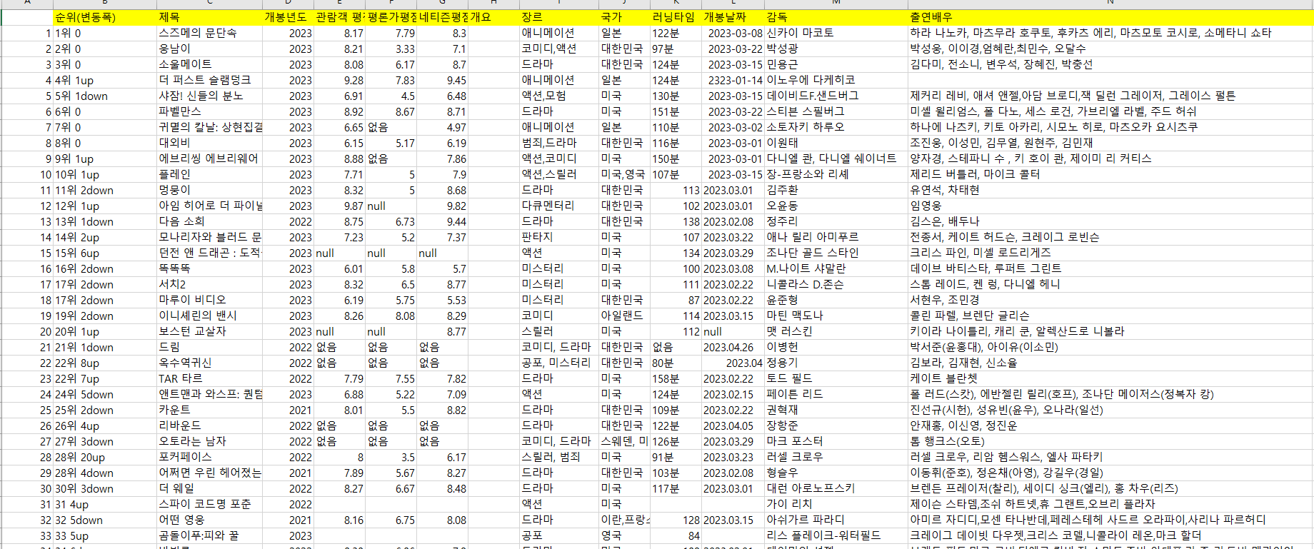 - 현재 랭킹에 있는 정보와 영화 상세 정보들을 크롤링 하여 excel에 종합하였다.