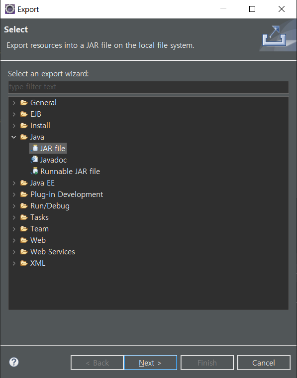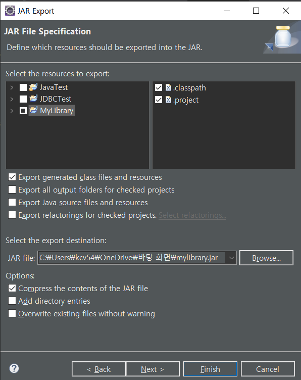 - 1. MyLibrary 프로젝트 파일을 마우스 오른쪽 클릭 후, export -> Java -> JAR file