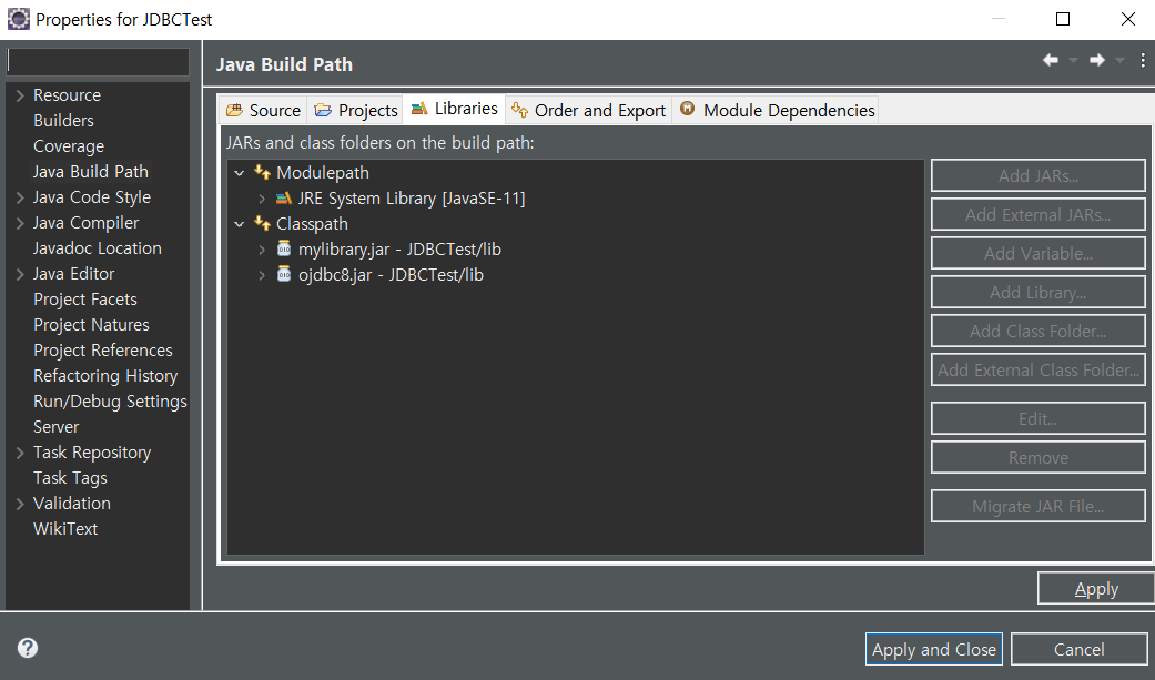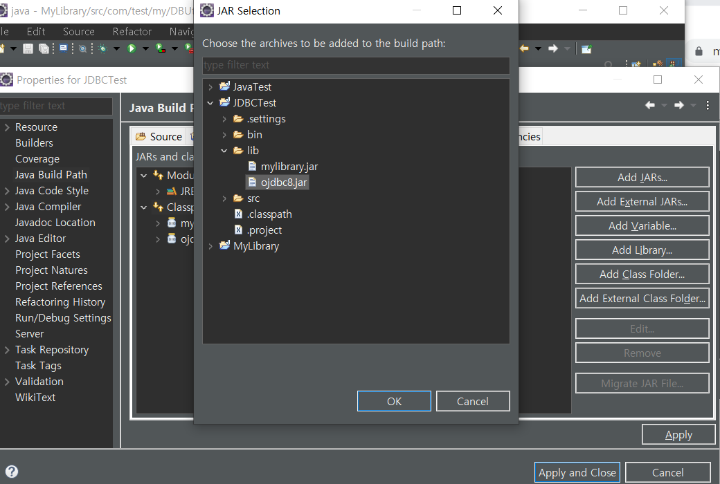 - 4. 가져온 ojdbc6.jar 파일을 buildpath 하기
