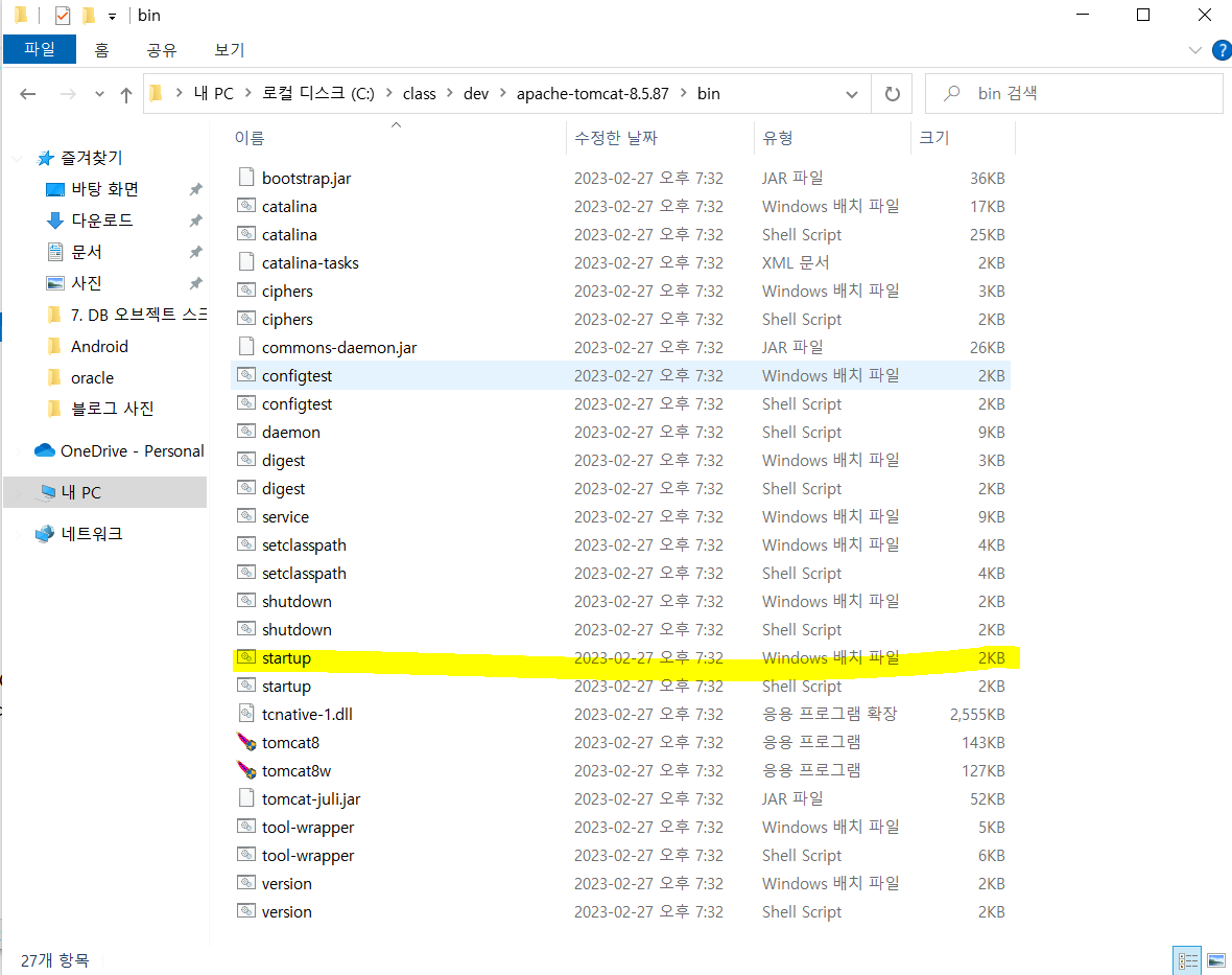 - C:\class\dev\apache-tomcat-8.5.87\bin > startup.bat