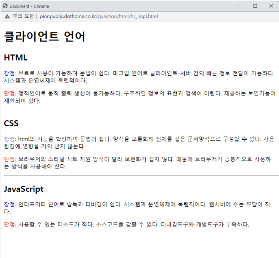<font color="red">단점 : </font> 정적언어로 동적 출력 생성이 불가능하다. 구조화된 정보의 표현과 검색이 어렵다. 제공하는 보안기능이 제한되어 있다.