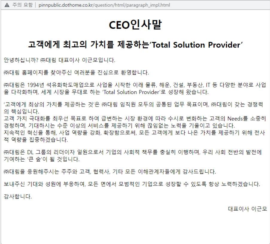 <p>안녕하십니까? ㈜대림 대표이사 이근모입니다.</p>
