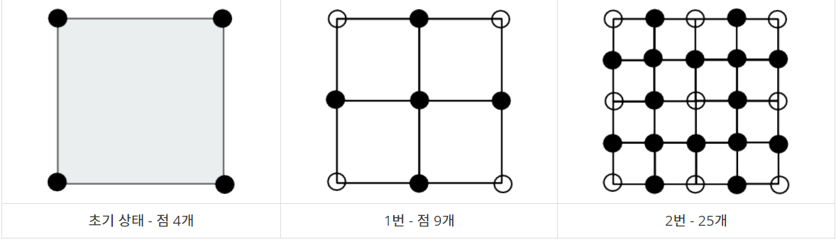 - 1. 정사각형의 각 변의 중앙에 점을 하나 추가한다.
