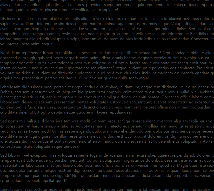 <p>Similique modi voluptate saepe, dicta nam ipsa! Ducimus laudantium sequi eum! Pariatur mollitia eum exercitationem, alias, iure, voluptate deserunt nobis minus quibusdam nulla expedita harum cum libero debitis sapiente. Fuga dolorum officiis facere distinctio repellendus alias ut fugiat voluptas a nisi molestiae deserunt quaerat, perferendis explicabo est iste ad totam ipsum voluptates beatae nemo. Exercitationem reprehenderit consequuntur laboriosam officiis dolorum repudiandae deserunt quisquam in saepe fugit. Laudantium deserunt, debitis ea enim asperiores necessitatibus odit accusantium natus dolore, quod neque consequuntur numquam assumenda quibusdam. Reiciendis quis nostrum culpa dignissimos perspiciatis aspernatur aperiam mollitia corrupti ut, quidem totam obcaecati molestiae quaerat delectus.</p>