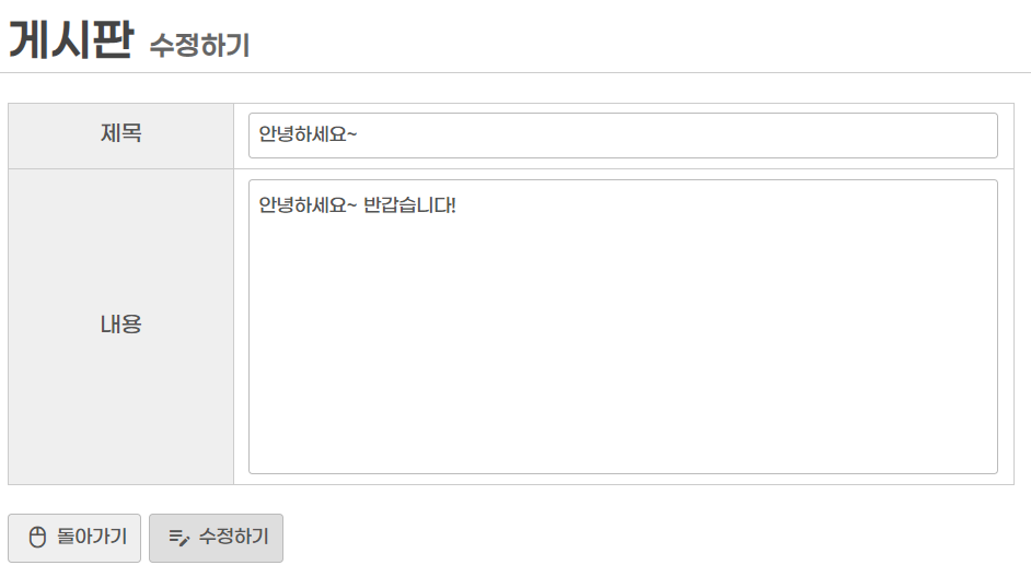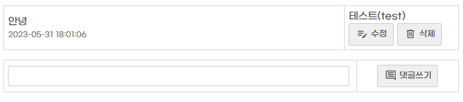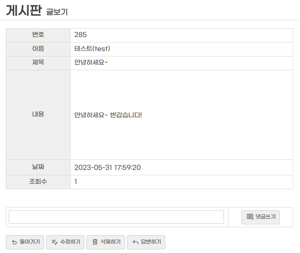 - 댓글 작성을 위한 폼을 표시하고 있습니다. <form> 태그를 사용하며, 댓글 내용을 입력하는 <input> 태그와 "댓글쓰기" 버튼을 포함하고 있습니다.