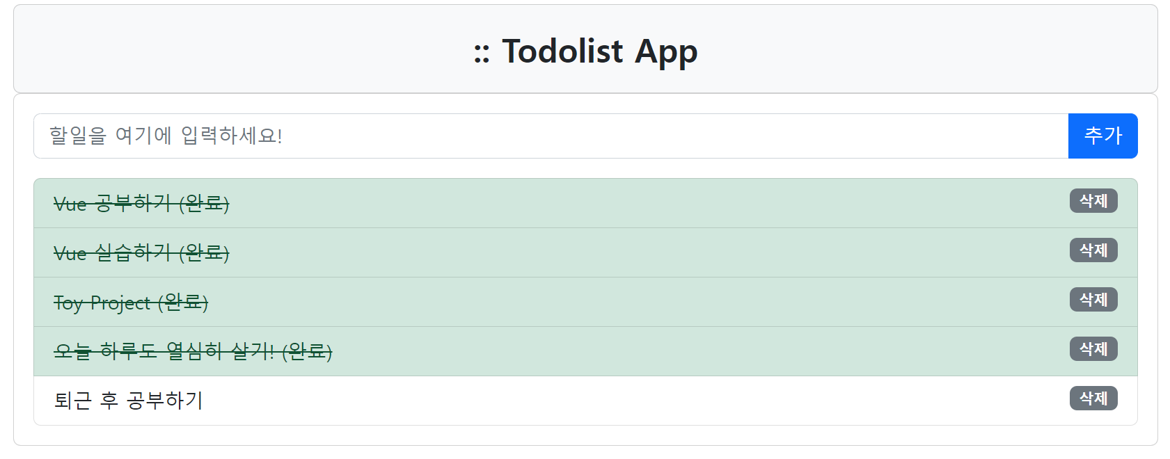- 삭제 처리 : 이벤트 .stop 수식어를 등록했음에 유의. 이 수식어를 작성하지 않고 삭제 버튼을 클릭하면 이벤트가 버블링하면서 완료 토글 이벤트까지 실행되면서 오류가 발생한다.