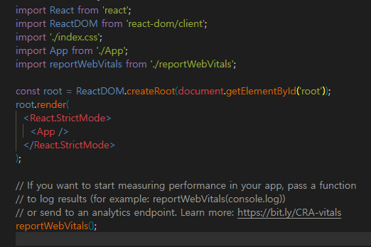 ✅ 웹 성능 측정을 위한 reportWebVitals 가져오기 - const root = ReactDOM.createRoot(document.getElementById('root'));