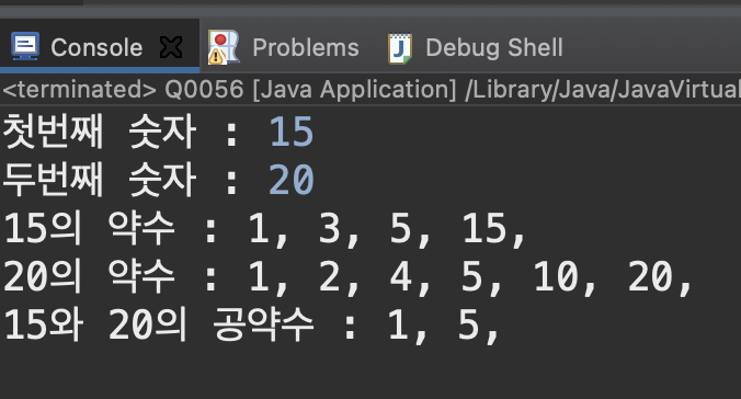 예제 18) 요구사항 : 숫자 2개를 입력받아 각각의 약수와 두 숫자 사이의 공약수를 구하라.